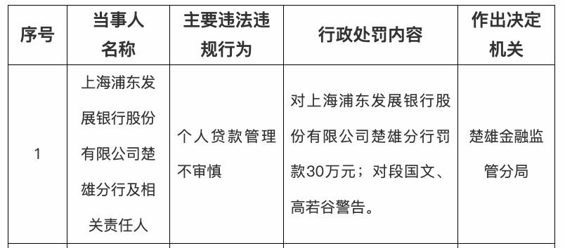 网财经讯 3月10日,据国家金融监督管理总局官网消息,浦发银行楚雄分行因个人贷款管理不审慎被罚款30万元,相关责任人段国文、高若谷受到警告。