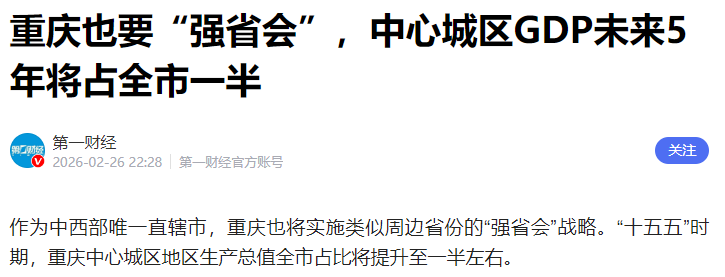 近日,面积、人口、级别均与省相当的直辖市重庆,也提出了“强省会”战略,未来五年要将中心城区的GDP占比提升到50%。