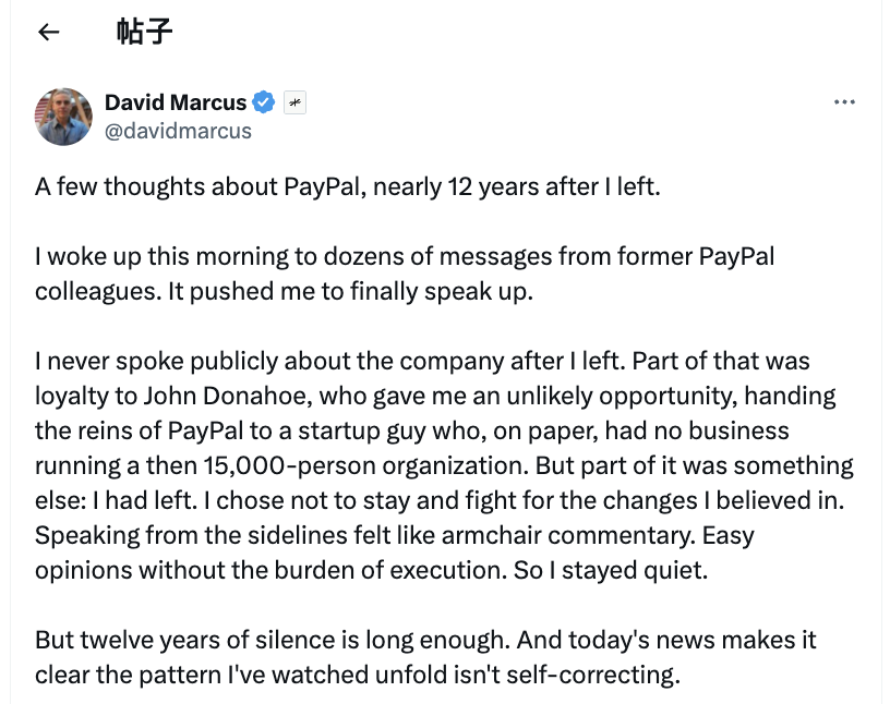 PayPal 财报发布次日,曾在2012年至2014年担任 PayPal 总裁的 David Marcus 发表长文,系统性复盘了 PayPal 为何会走到今天这一步。