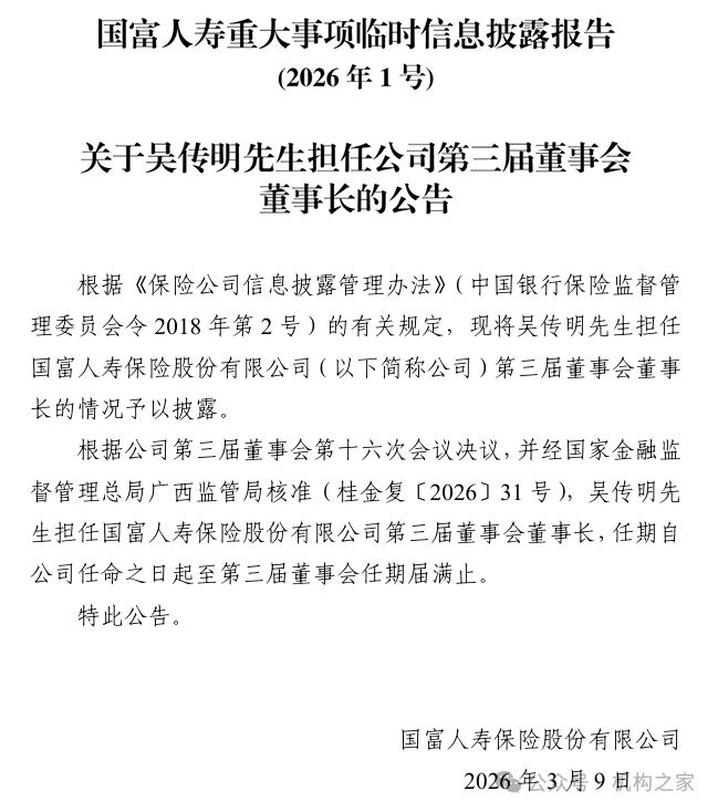 在时隔近一年后,国富人寿董事长一职终于正式落定。机构之家获悉,3月9日,国富人寿发布公告:根据公司第三届董事会第十六次会议决议,并经国家金融监督管理总局广西监管局核准(桂金复〔2026〕31号),吴传明担任国富人寿第三届董事会董事长。这位自2025年8月起代行董事长职务的“老国富人”,就此完成从“代”到“正”的身份转换。