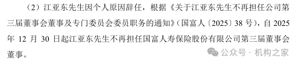 王海河离任后,经董事推举,暂由公司董事江亚东代为履行董事长职权。这位“80后”此前还担任广投集团人力资源部总经理、党委组织部/党委统战部部长。但根据国富人寿2025年四季度偿付能力报告,江亚东已于2025年12月30日卸任公司董事。